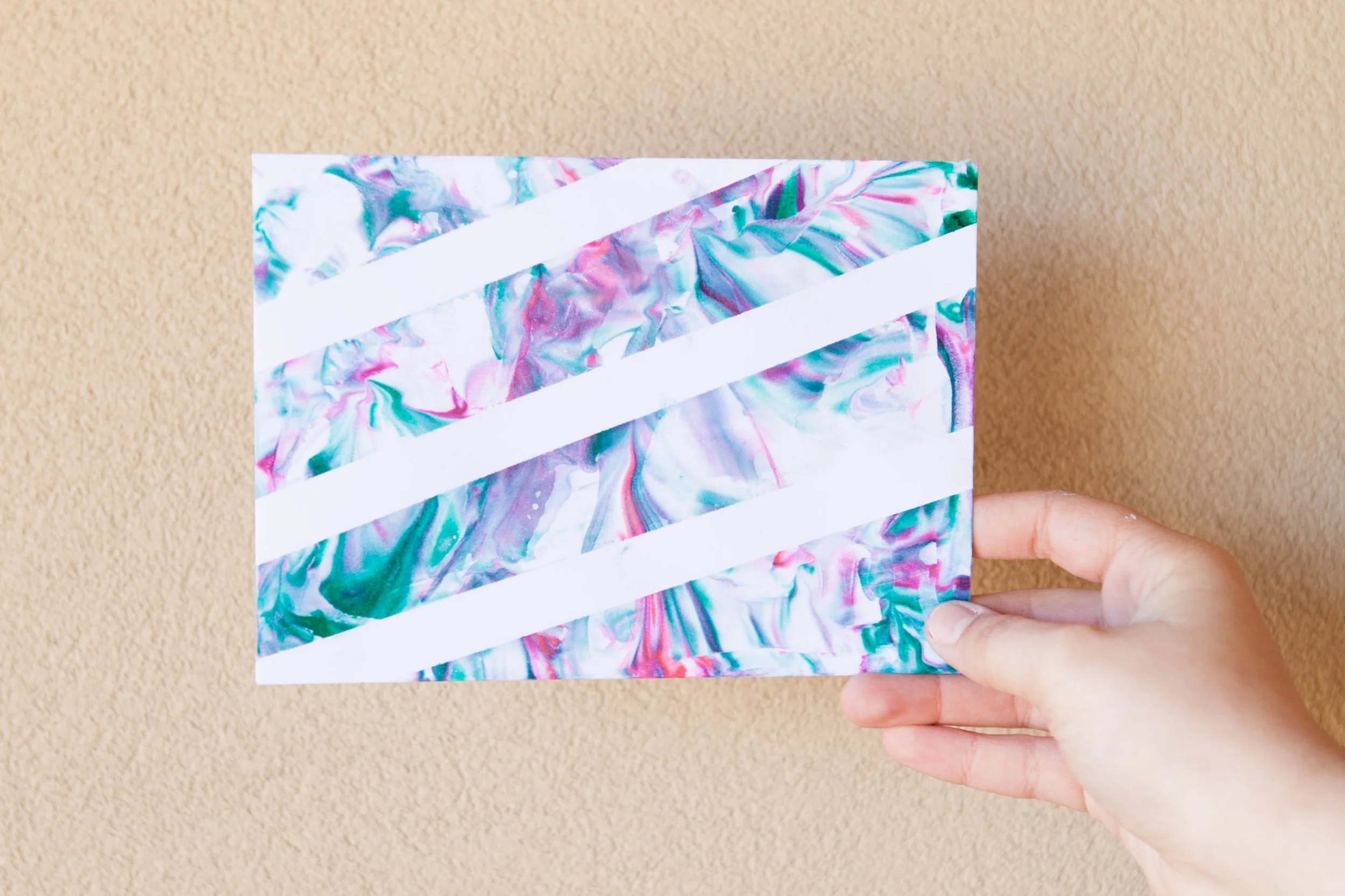 Choose what design you want to have on your envelope or stationery! If you are looking for a marbled look, tape the edges on the backside of the envelope. If you want a zigzag design, place tape on the front and the back. (It keeps it from bleeding through.) Then, place the paper in the shaving cream. Make sure all of the surfaces are touched!